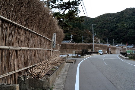 こちら(左写真)は大沢の西方に位置する上大沢で、同じく間垣の見られる集落。厳しい北風が吹き付ける、日本海の厳しい冬に立ち向かうために作られたのが間垣で、その奥で守られている家屋の姿は、通りからはほとんど見えない。