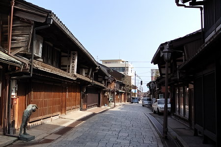 高岡の市街地で町並みが残っているのは鋳物作りが行われた町屋が並ぶ金屋町(タイトル及び2枚目の写真)及び蔵造りの建物が並ぶ山町(左、及び4枚目の写真)の主に2箇所。これ以外に、米穀商で栄えた海沿いの吉久地区にも町並みが残り、いずれも重伝建地区となっている(吉久は別のページで紹介)